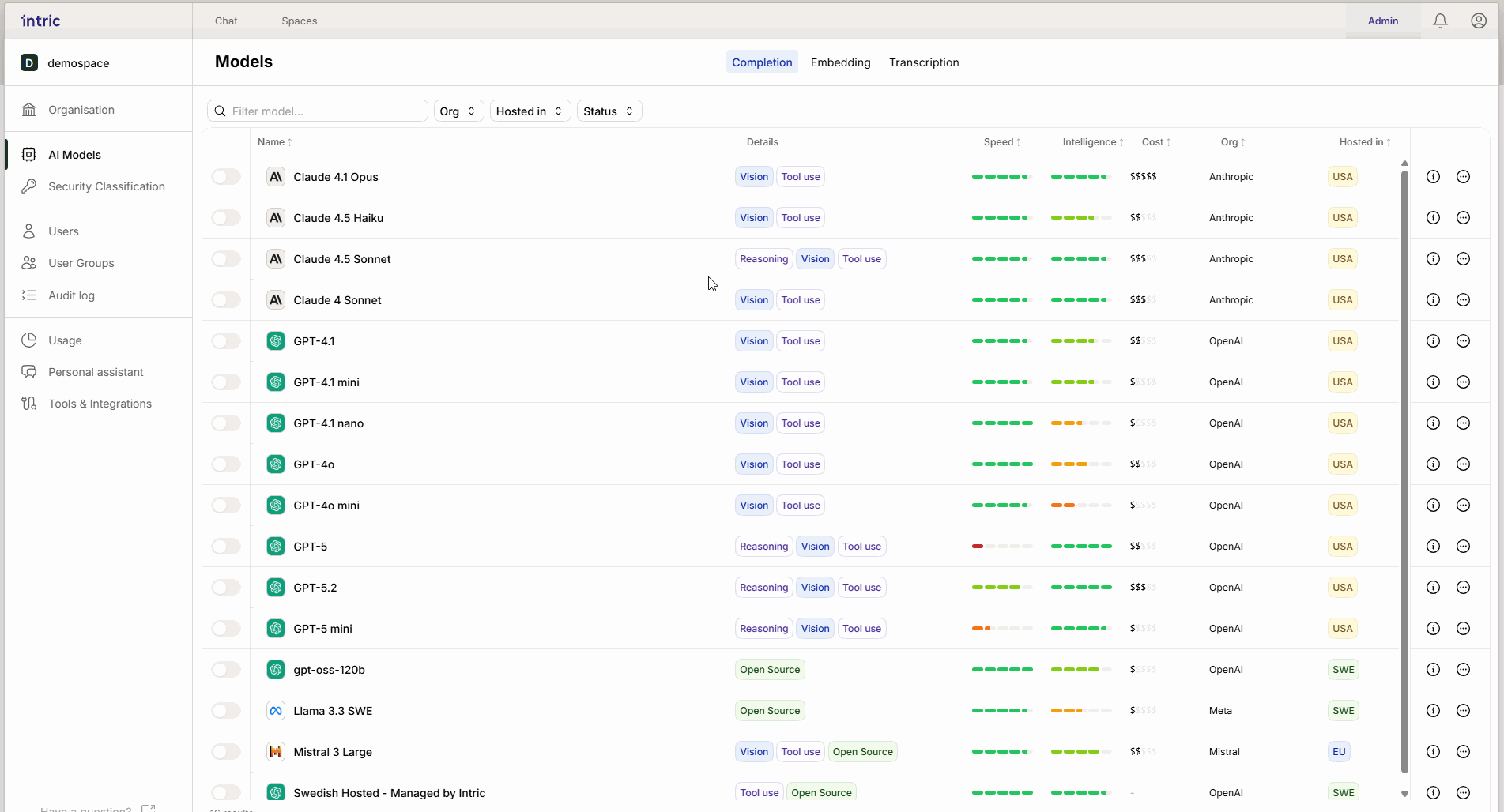 In dieser Ansicht erhältst du einen Überblick über alle Sprachmodelle, die dir zur Verfügung stehen, sowie die Verwaltung, welche Sprachmodelle in der Intric-Umgebung deiner Organisation verfügbar sein sollen. Als Administrator kannst du genau steuern, welche Modelle in verschiedenen Teilen der Plattform verfügbar sein sollen. Durch die Verbindung spezifischer Modelle mit verschiedenen Sicherheitsklassen kannst du sicherstellen, dass ressourcenintensive oder spezialisierte Modelle nur dort verwendet werden, wo sie wirklich gebraucht werden.